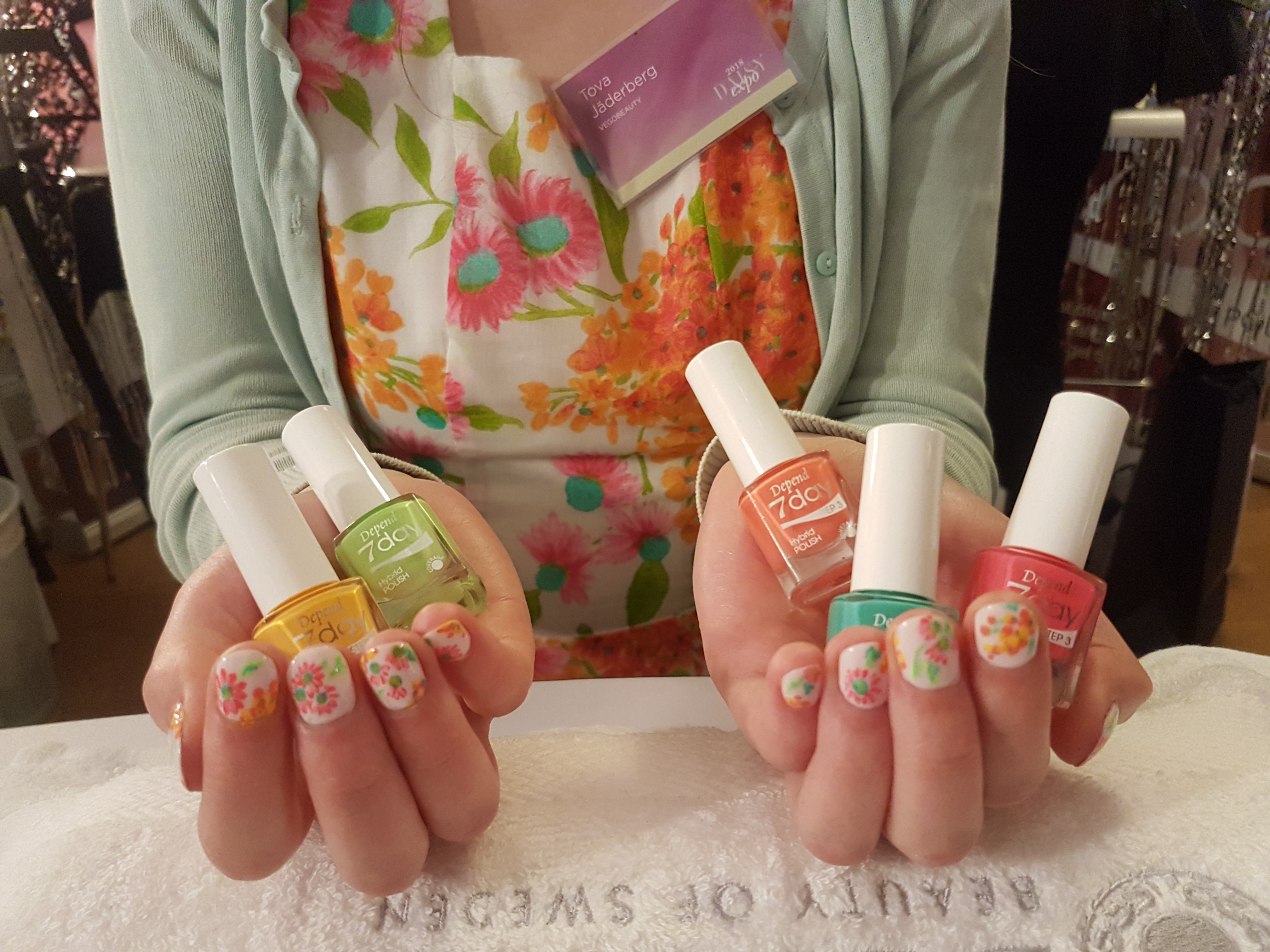 Åh vad jag blivit kär i Depend tack vare expot! Bland representanterna i deras monter med disco-tema fanns självklart pressansvariga och även makeup artister och nageltekniker. Det bjöds på bubbel, lösfransar, glitter och naglar! Jag fick först ett par jättefina fransar applicerade, och sen mina naglar målade! Lisa som arbetade där älskade min klänning och gjorde matchande naglar åt mig med deras 7-day Hybrid Polish. De blev hur fina som helst och det kändes så lyxigt och mysigt! Jag fick några produktprover med mig och en del tips för att rädda mina ledsna naglar så jag ska definitivt skriva om min kommande nagelresa. Foto av Linda Vesterby.