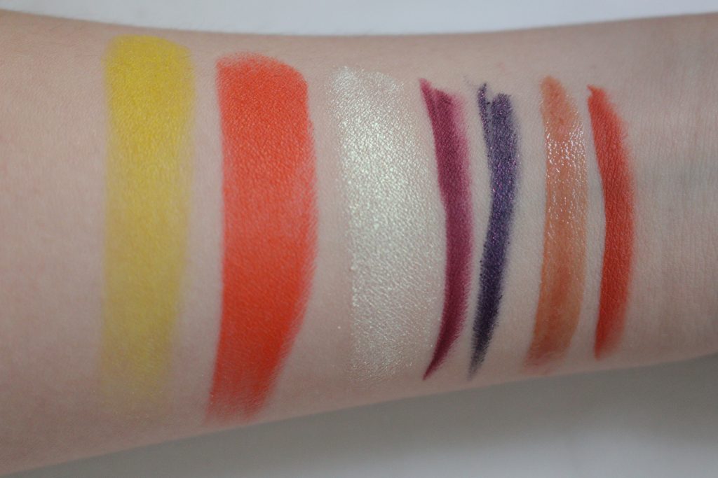Från vänster till höger: ögonskuggor Banana, Magma, Peyote. Ögonpennor Distortion, Purple. Läppglans Allgoria della Primavera. Läppenna Cult.
