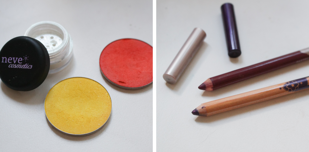 Neve har två olika sorters ögonskuggor, pressade skuggor i refill-format och lösa mineralskuggor. De pressade skuggorna är magnetiska och du kan göra en egen palett eller köpa en färdig. På bilden är den lösa skuggan Peyote och de pressade Banana och Magma. Magma är helt fantastisk och är en av de bästa produkterna jag äger! Sådant tryck i pigmentering, och en dröm att jobba med. Ska du testa något, välj Magma! Tyvärr är Banana lite mindre imponerande, den går att bygga upp men har inte samma oumph som Magma. Den är lite för skir och pudrig. Funkar dock fint att blanda ut andra färger med och som rouge!