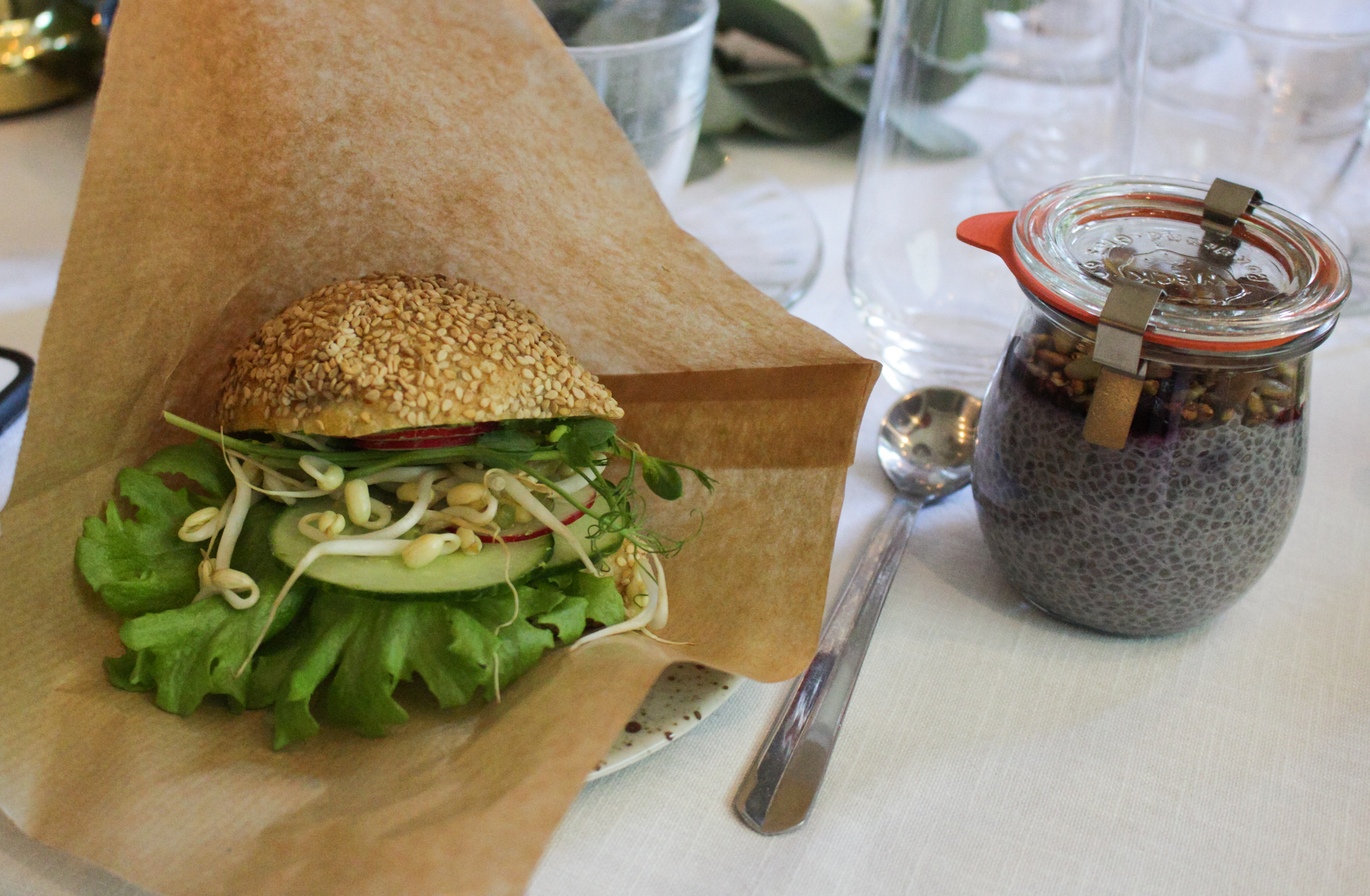 Det bjöds på macka med grönsaker och ärthummus, och chiapudding med blåbär och frön från Sally Voltaire & Systrar. Ärthummusen var fantastisk! Jag har blivit mycket för ärtor på sistone, så detta måste jag testa att laga själv.