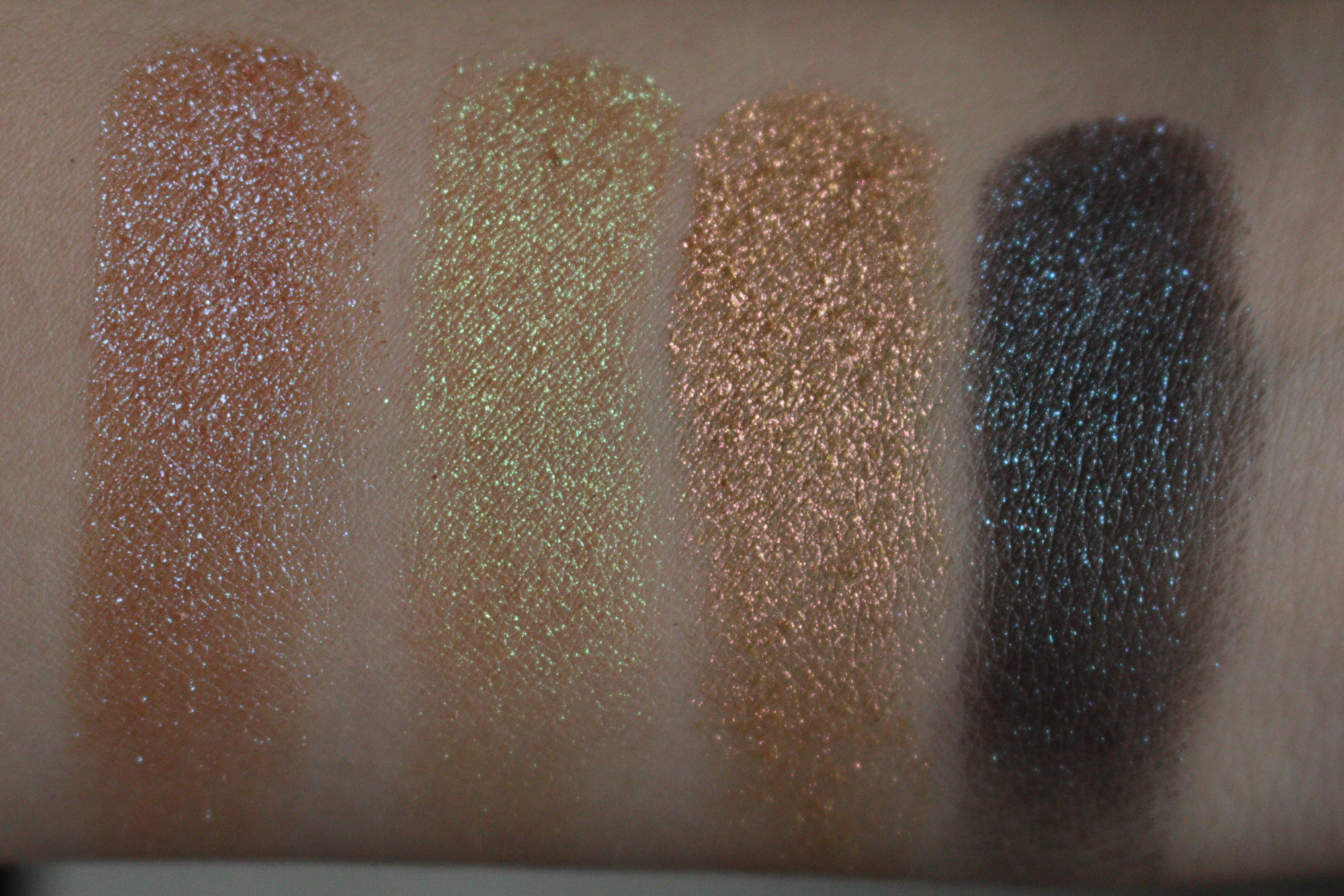 När de används som vanligt, så blir de skira och på min hudton så blir Moonwake, Ethereal och Zephyrs varma ton inte jättetydliga, utan det är den mer kontrasterande som syns bäst. Orphic är den nyans som har en mest tydlig basfärg och kan byggas upp till full opacitet. De andra blir jättefina som en skir färg med ett fint glitter, och perfekt att bara snabbt smacka på ögonlocken när man bara vill ha något enkelt men fint. Jag gillar att använda Zephyr över ett persikofärgat rouge för att ge det lite mer stuns, de smälter ihop jättefint och blir som highlighter och rouge i ett. Har du mörkare hy än mig kommer de tre första antagligen fungera fint som highlighter. Det är dock över en mörkare bas som dessa poppar som mest, då det kontrasterande skimret får skina. Skuggornas skimmer är som väldigt fint glitter, det applicerar jämnt och fint gör inga klumpar men kan damma runt lite.