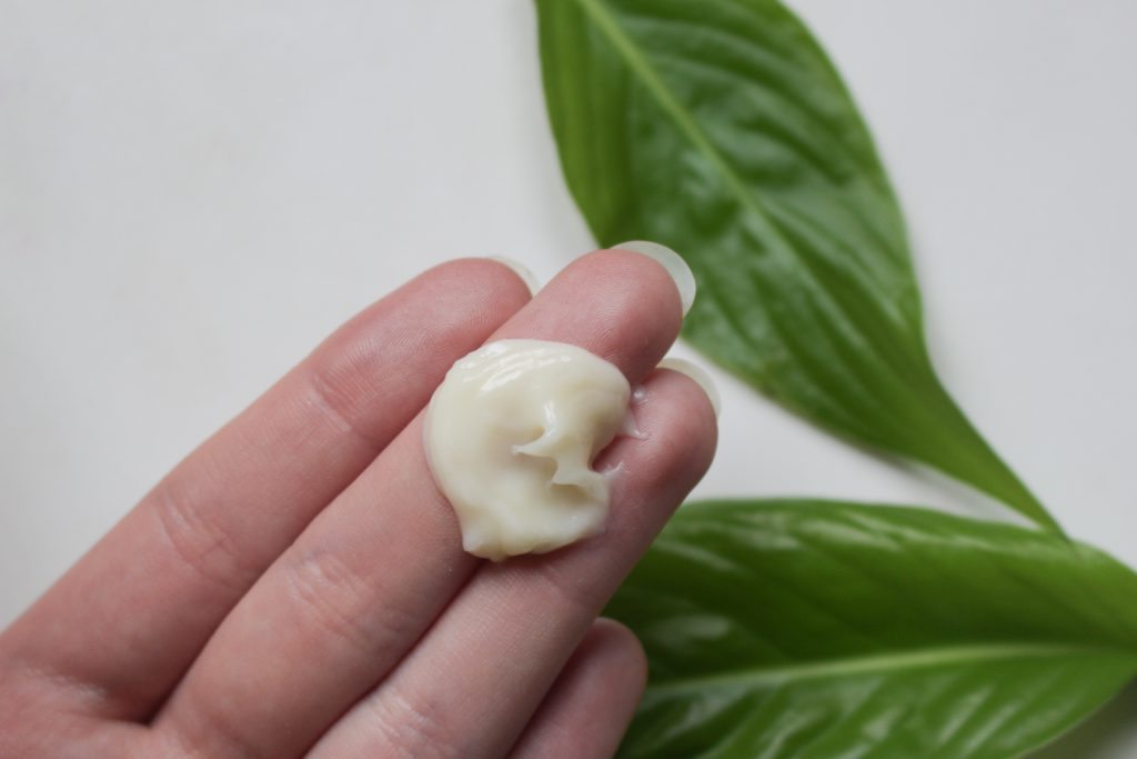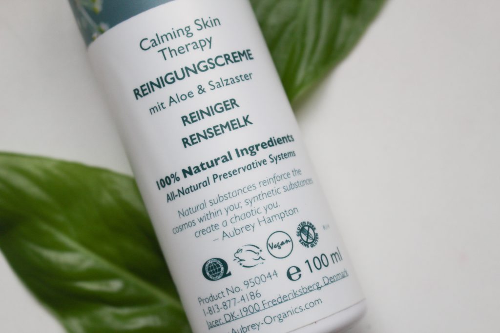 Aubrey Organics Calming Skin Therapy Cleanser är en ansiktstvätt i krämform med aloe vera och strandaster. Den ska vara återfuktande och lugnande, och passa känslig hy. Detta låter ju perfekt för min småkänsliga vintertorra hy! Det första jag reagerar på är dock hur stor andel denaturerad alkohol produkten innehåller – det är fjärde ingrediensen. Jag antar att det behövs som bakteriedödande då denna produkt är vattenbaserad men inte innehåller något annat konserveringsmedel. Denaturerad alkohol är väldigt uttorkande för hyn, för fet eller blandad hy kan detta leda till att hyn sedan producerar ännu mer talg. Dessutom förstör det hyns naturliga skydd mot föroreningar, bakterier och så vidare. Rengöringen innehåller även citrusoljor, vilket jag förut fått allergiska reaktioner av och är en vanlig irritant. Annars innehåller den mycket aloe vera, och oljor och fettsyror från växtriket. Inget märkvärdigt. Hursom, jag ger produkten en ärlig chans.