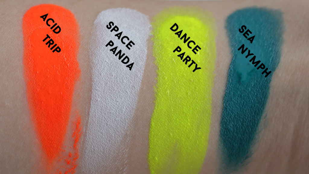 Alla nyanser av SUVA Hydra Liners är veganska (deras ögonskuggor är också veganska, förresten). De flesta presterar riktigt fint, men de ljusaste, som den vita Space Panda och gula Dance Party, tenderar att spricka om man gör för tjocka lager. De finns tre olika varianter: matta färger, metalliska färger, och UV-färger. Sist men inte minst, lite swatches på de jag har. Andra och tredje från vänster är UV, de andra matta.